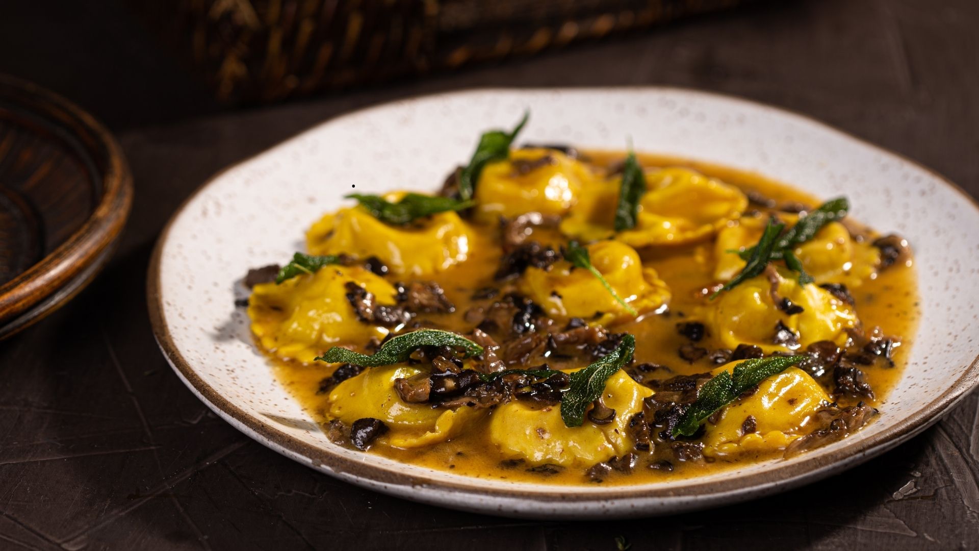 Ravioli de taleggio com ragu de cogumelos e manteiga de sálvia